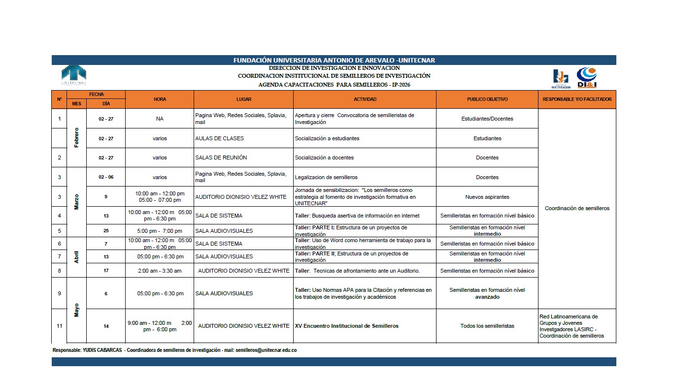 Para orientar el desarrollo de los semilleros en los programas, se desarrollan de forma periódica, seminarios y otras capacitaciones para los semilleristas. Los cursos que se imparten están relacionados con metodologías y alcances de la investigación, redes sociales, sistema de investigación de la institución y Sistema Nacional de Ciencia y Tecnología en Colombia.