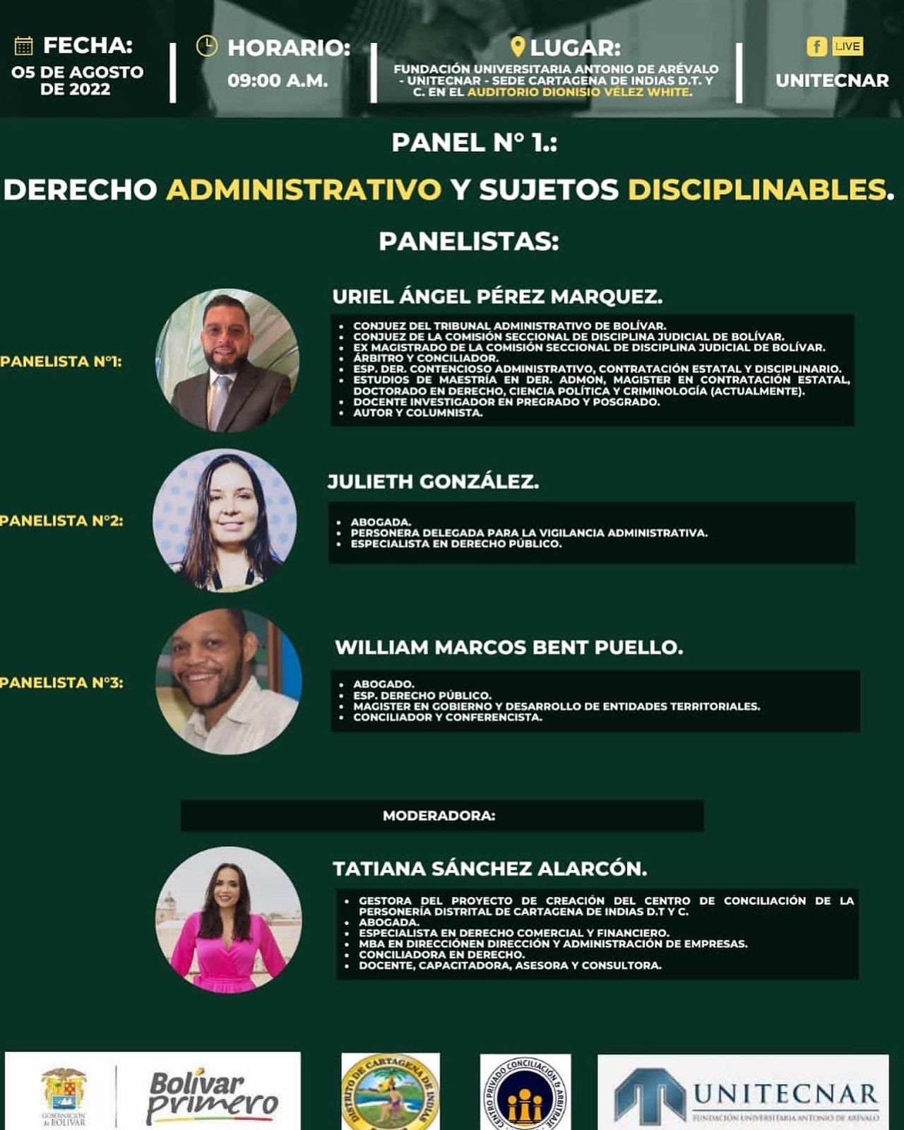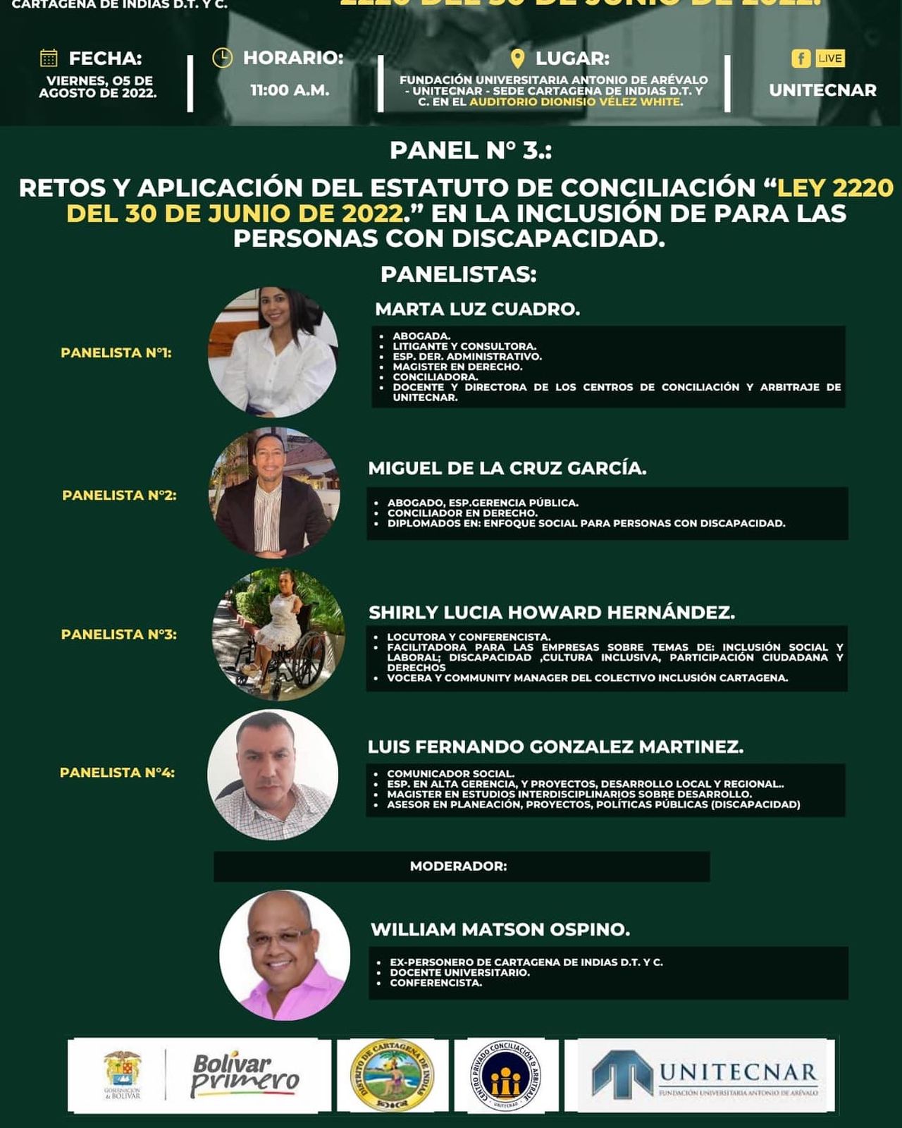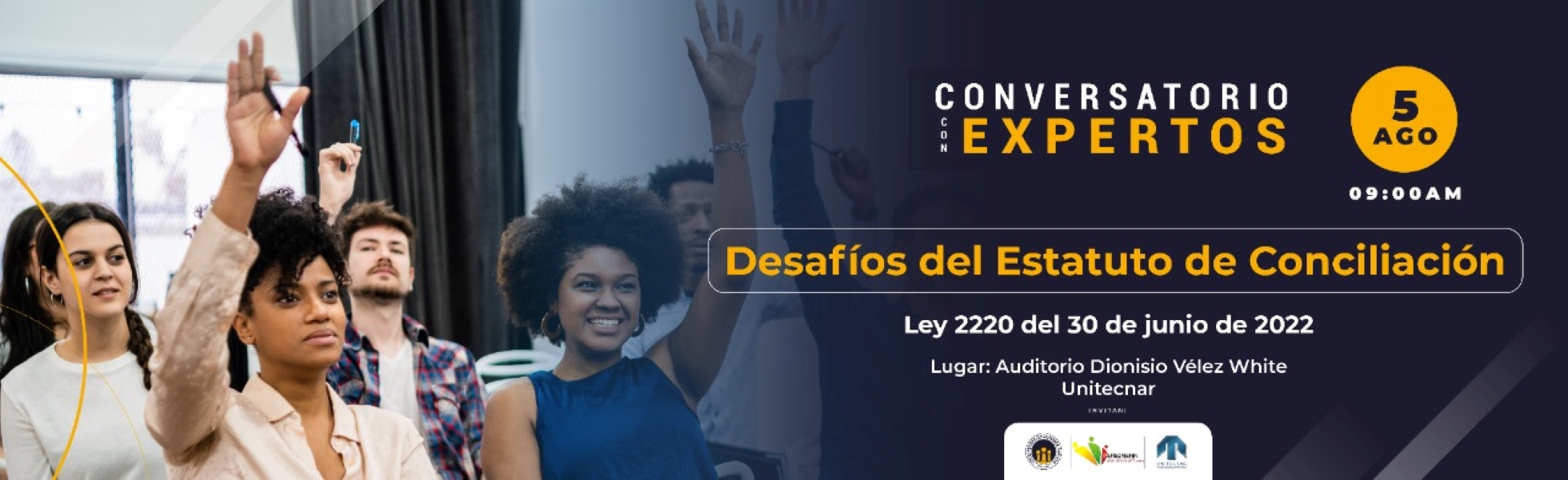 El conversatorio se realizará de manera híbrida en la modalidad virtual a través de la sala zoom Click Aquí y de manera presencial tendrá lugar en el Auditorio Dionisio Velez White de UNITECNAR el día viernes 5 de agosto de 2022 a la 9:00 a..m y contará con la presencia de importantes juristas locales y nacionales.