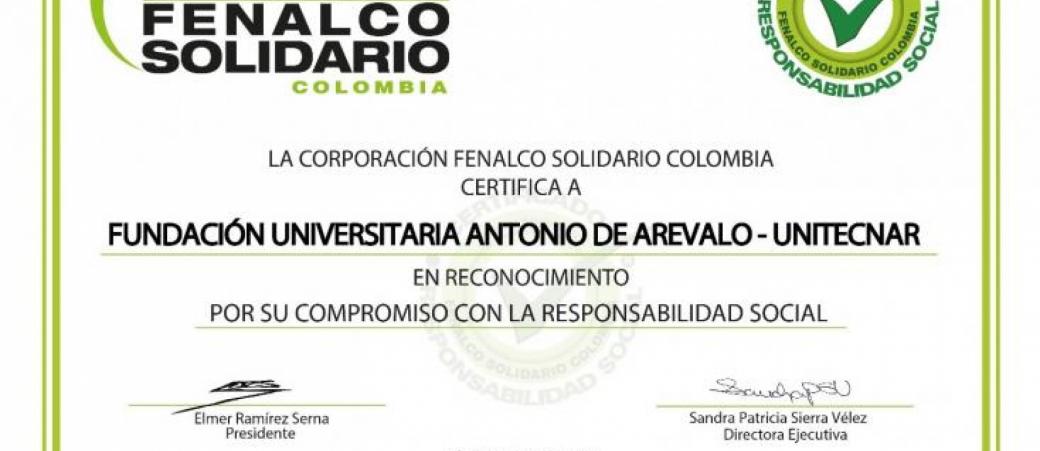 La Corporación Fenalco Solidario Colombia, entidad que promueve temas de responsabilidad social en el país, le otorgó nuevamente a la Fundación Universitaria Antonio de Arévalo un reconocimiento por su compromiso con la Responsabilidad Social, con un porcentaje de 98.86% de cumplimiento.